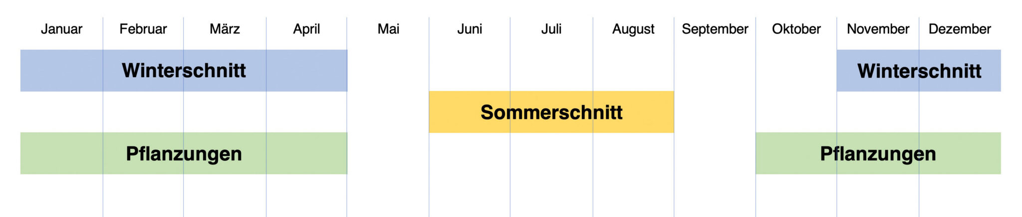 Unter bestimmten Voraussetzungen können Pflanzungen und Schnittmaßnahmen das ganze Jahr über durchgeführt werden.